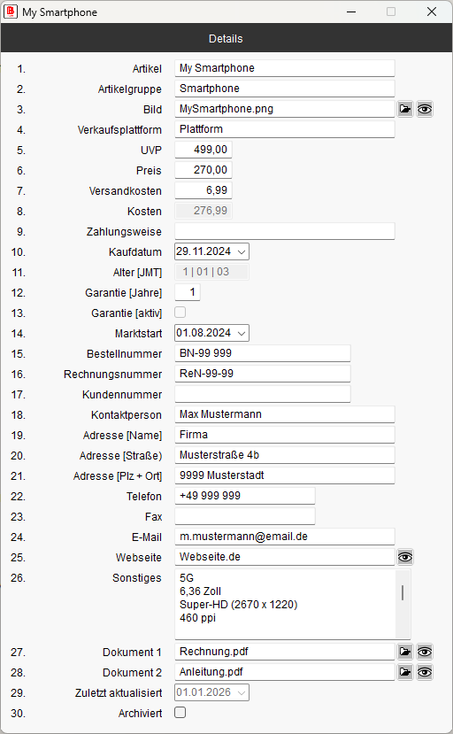 Dieses Negativerlebnis brachte mich zu der Überzeugung, dass eine Datenbank bzw. ein Programm sinnvoll wäre, um solche Käufe zentral erfassen zu können. Hier erkenne ich nun mit einem Blick das exakte Alter des Artikels in Jahren, Monaten und Tagen und ob es noch Garantie hat. Ich weiß jetzt auch, wo ich die Rechnung und eine Anleitung zu einem Gerät finde.